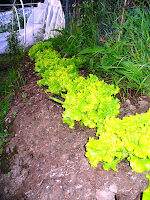 Lettuce, carefully planted from seed in little pots in the house, cared for diligently by Isaac, and then delicately transplanted into our garden when they were a couple weeks old, hoping the shock from the transplant wouldn't kill them. Good job, Isaac...